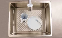 Praktischer Geschirrabtrockner mit Kunststoffgehäuse und Gitterhalterung aus Metall. Mit abnehmbarer Besteckschale und integrierter Abflussvorrichtung.