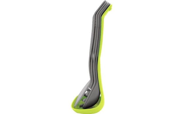 Die Kelle ist zugleich Boden als auch Abropfschale. Alle Teile sind übereinander stapelbar und werden durch einen Magnet stabil zusammen gehalten.