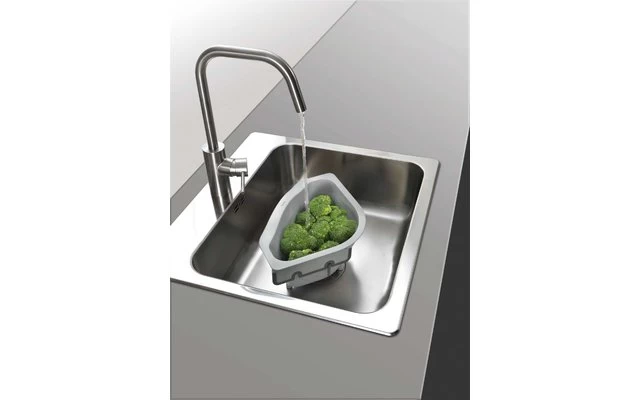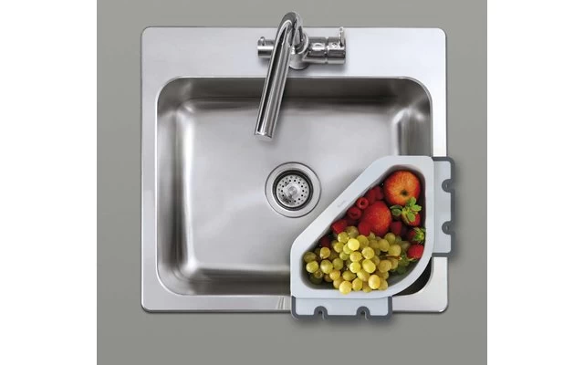 Drain-On Ecksieb aus Kunststoff, mit variablen Anti-Slip Klappen zur Befestigung am Spülbeckenrand.