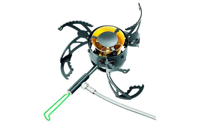 Dafür sorgt ein überragender, verlässlicher, eindüsiger Brenner, bei dem unterwegs weder Düse noch Zubehör getauscht werden müssen. Benutzt man LPG-Gaskartuschen, muss lediglich zwischen dem 4-Saison-Modus bei Kälte oder dem Brennsparmodus gewählt werden.