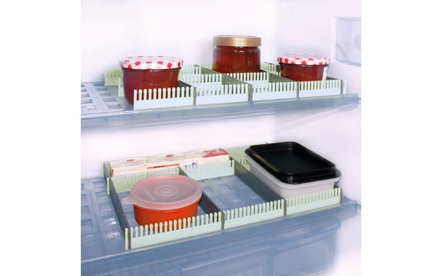 Das Stecksystem besteht aus 8 Stauleisten, die einen variablen Facheinsatz ergeben. Die Längs- und Breitstege aus flexiblem Kunststoff bieten optimalen Trennschutz für verschiedene Artikel und stabilisieren dadurch ihre Gegenstände bruchsicher und rutschfest. An der oberen Längsseite einer Stauleiste befinden sich viele Zinken, die durch einfaches Zusammenstecken eine stabile und feste Verbindung ergeben. Die enge Rasterung der Zinken ermöglicht eine flexible Verstellbarkeit auf fast jeden Abstand. Geeignet für Lebensmittel aller Art, Aufbewahrungsbehältnisse, Einmachgläser,