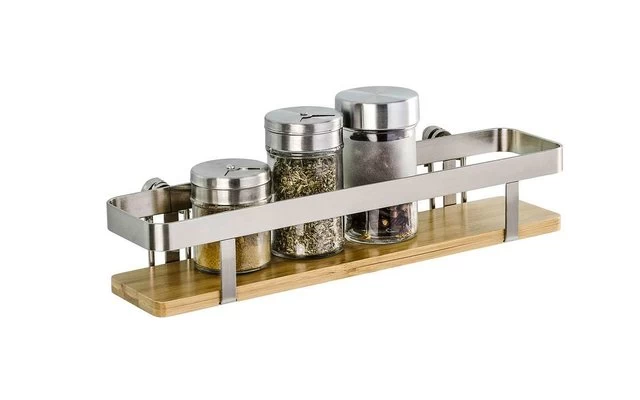 In dem Gewürzbord aus hochwertigem, gebürstetem Flachstahl sind alle Gewürze, aber auch Flaschen und Dosen griffbereit aufbewahrt. Das Regal mit einer Ablagefläche aus Bambus bietet Platz für bis zu sechs Gewürzbehälter.